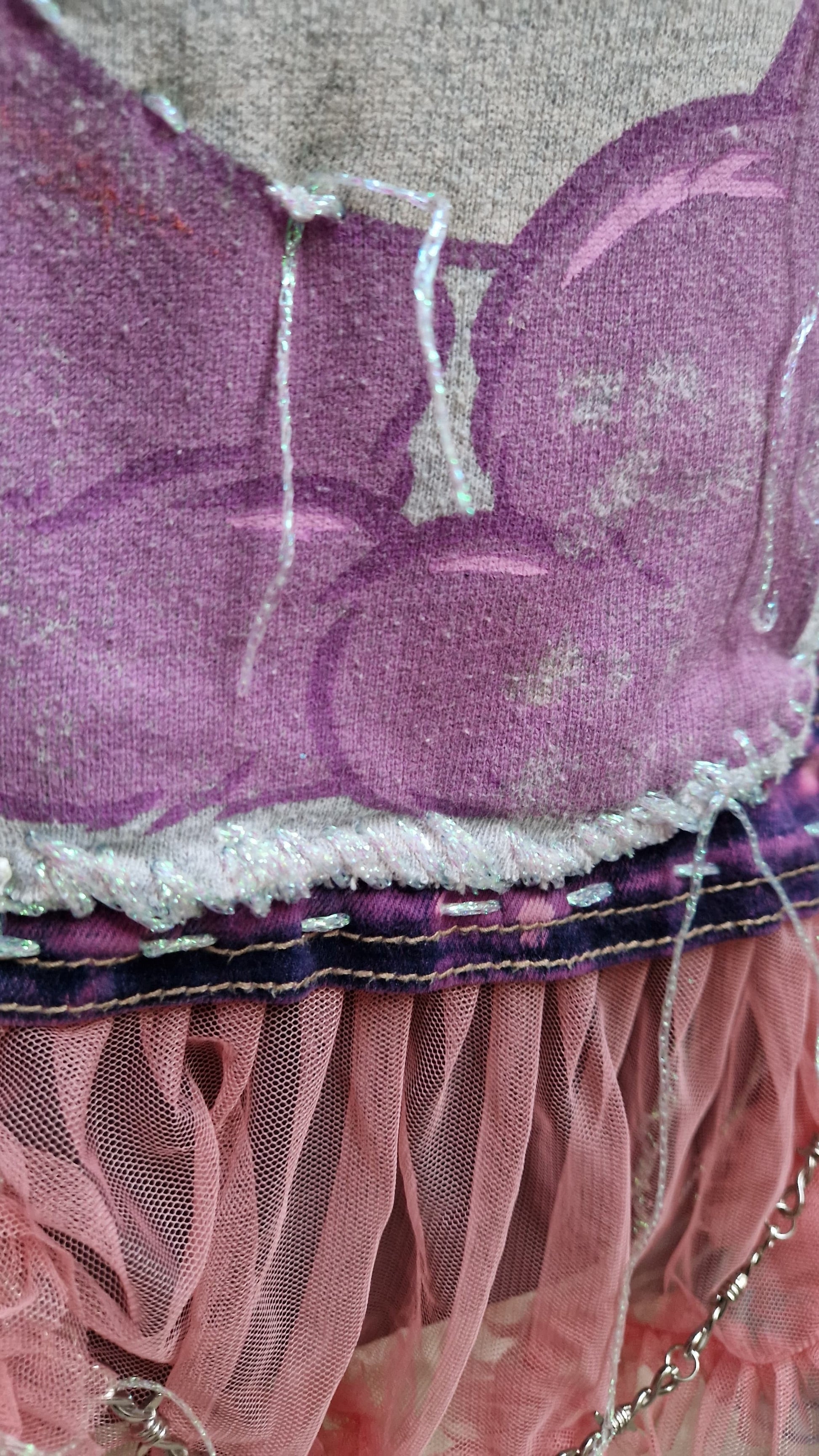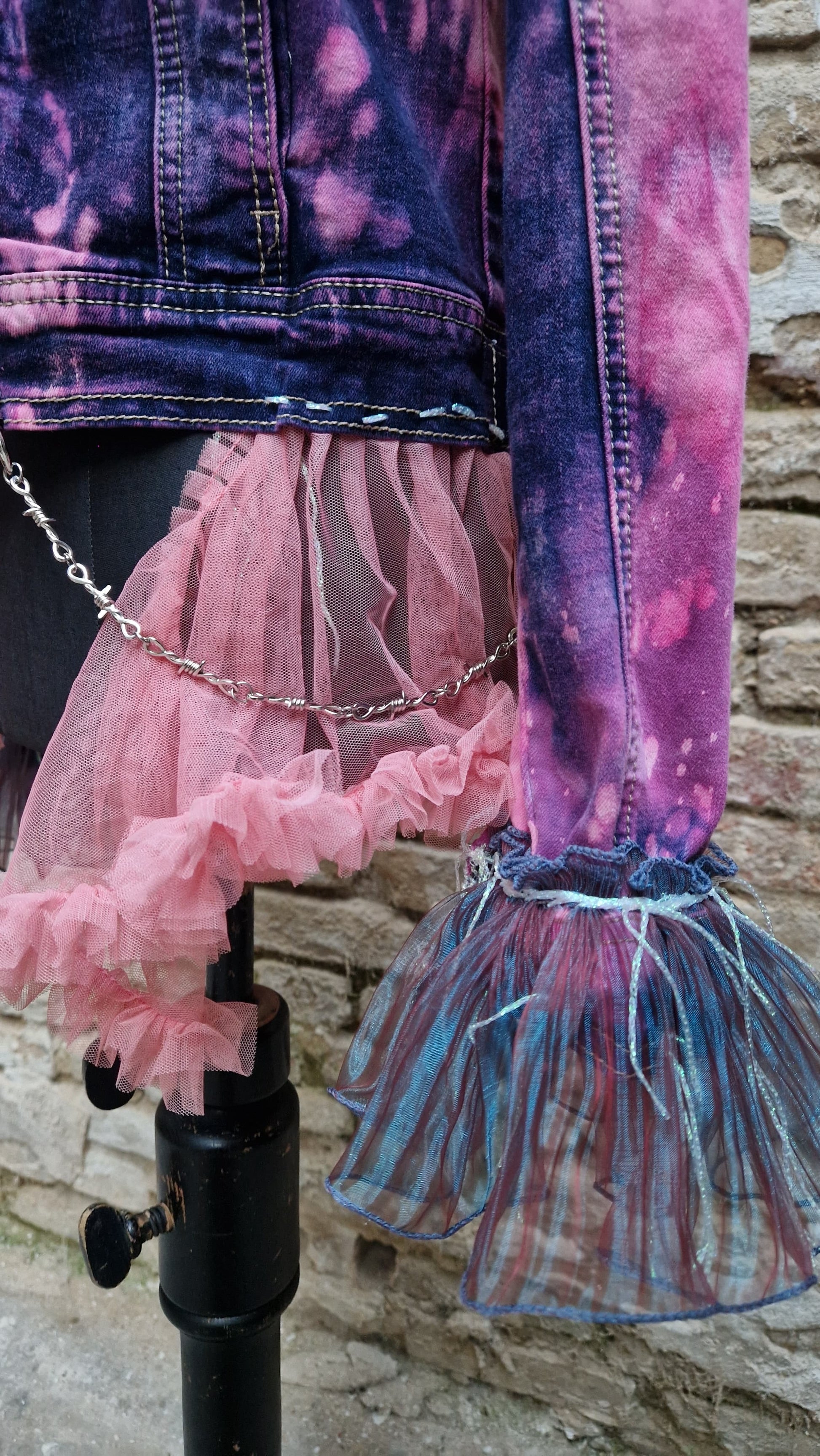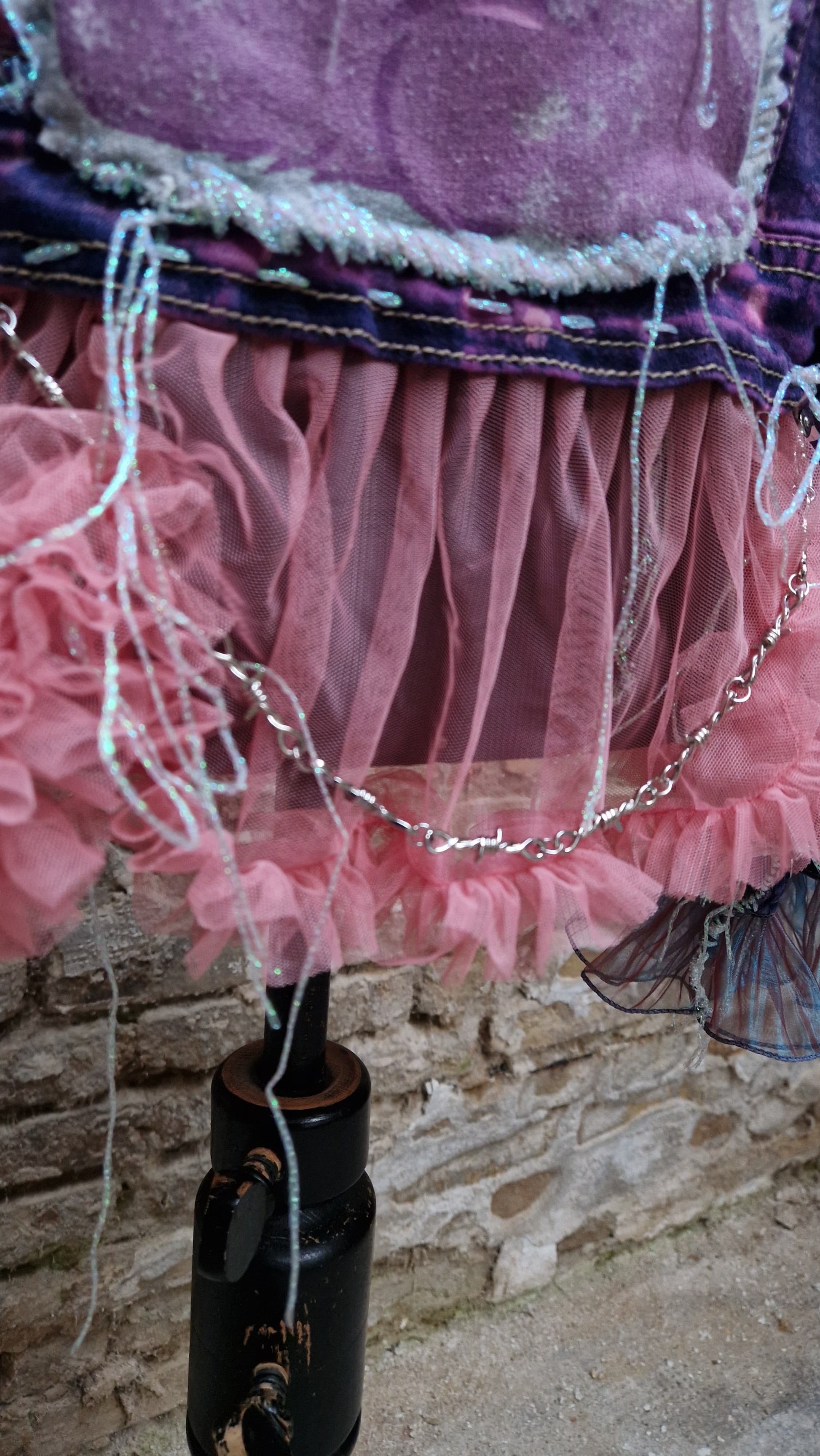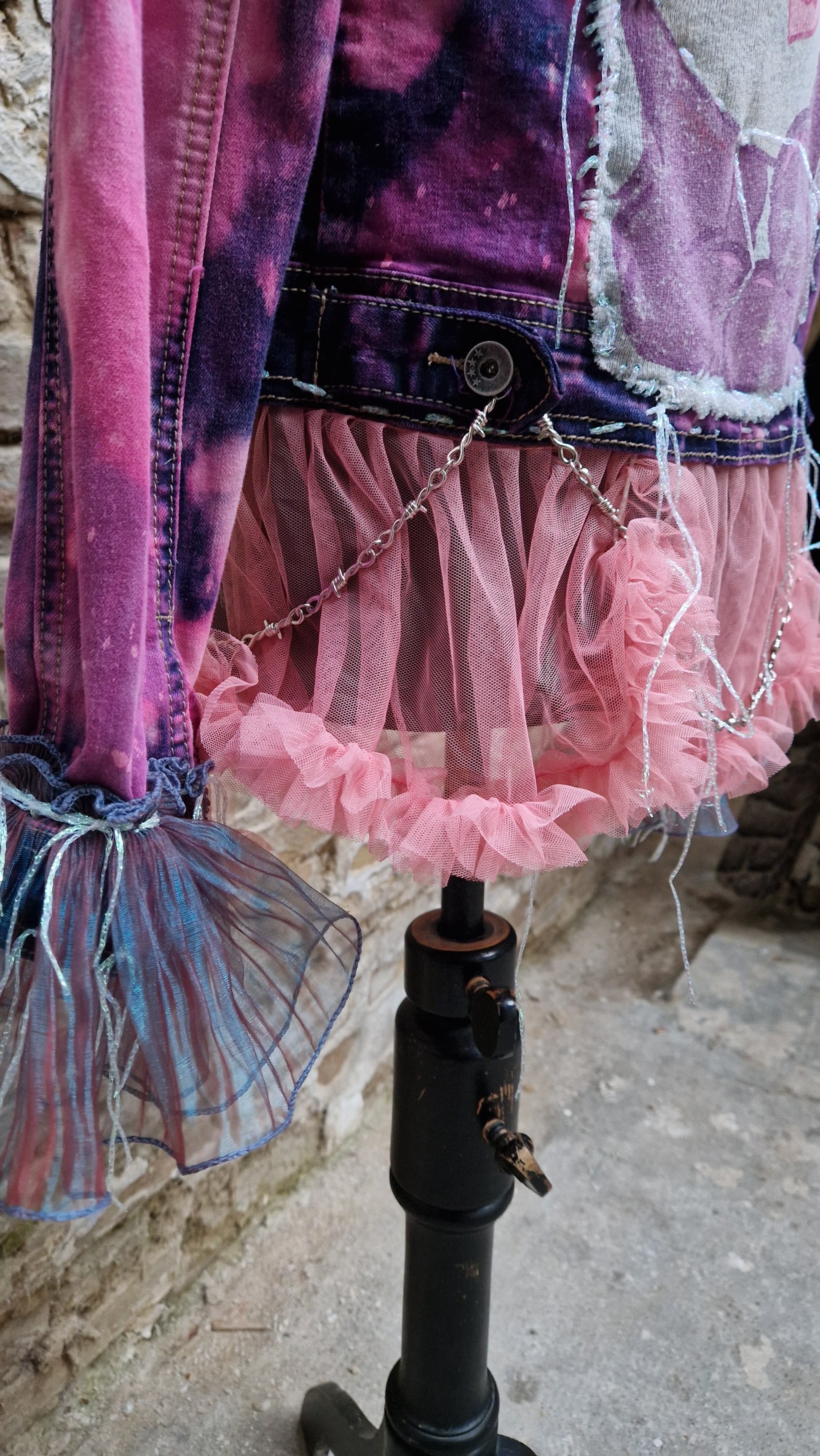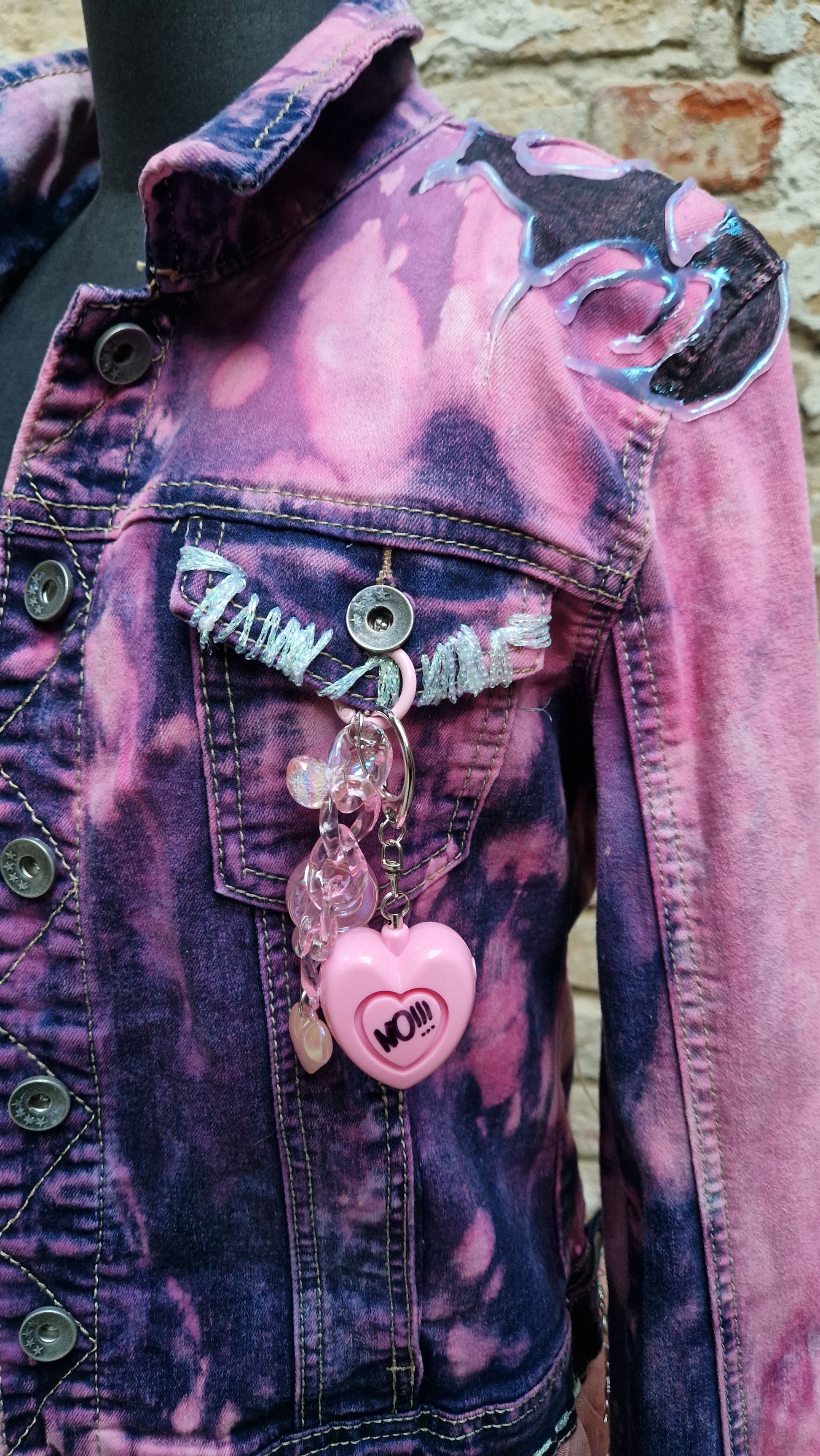 Das pink-violette Batik-Farbspiel macht jedes Stück einzigartig. Am Saum sorgt ein verspielter Tüll-Rock-Detailabschluss mit Kettenelement für einen überraschenden Kontrast zwischen Punk und Princess-Core. Ergänzt wird das Design durch dekorative Anhänger und einen rosa Herz-Panikknopf mit „NO!!!“, der dem Piece eine ironisch-provokante Note verleiht.