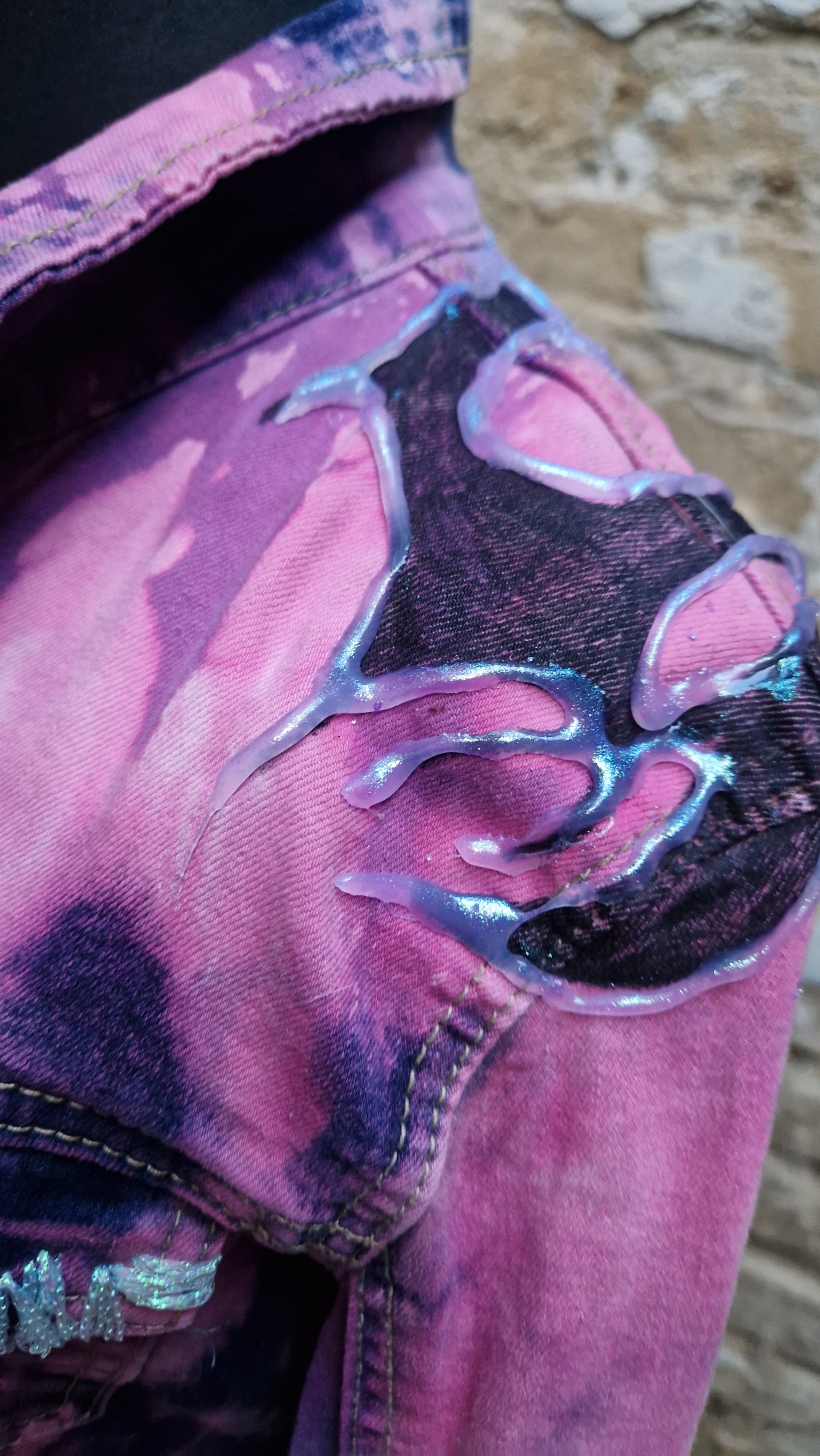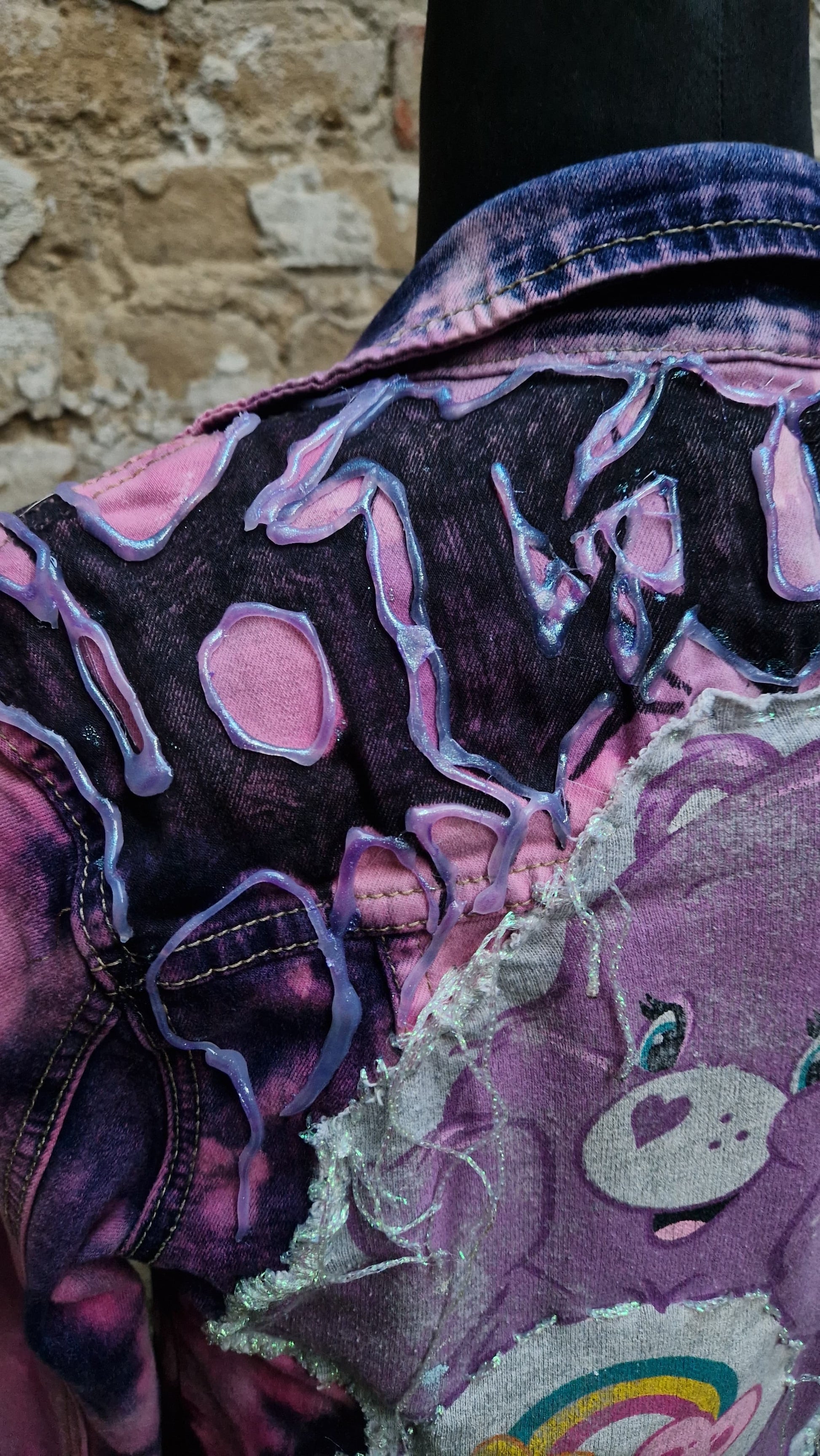 Der Rücken wird von einem großen, vintage-inspirierten Bärenmotiv dominiert, das bewusst roh mit offenen Kanten und sichtbaren Nähten verarbeitet wurde. Darüber verlaufen schimmernde, tropfende Applikationen, die wie geschmolzener Lack wirken und der Jacke eine fast surrealistische, edgy Ästhetik geben.